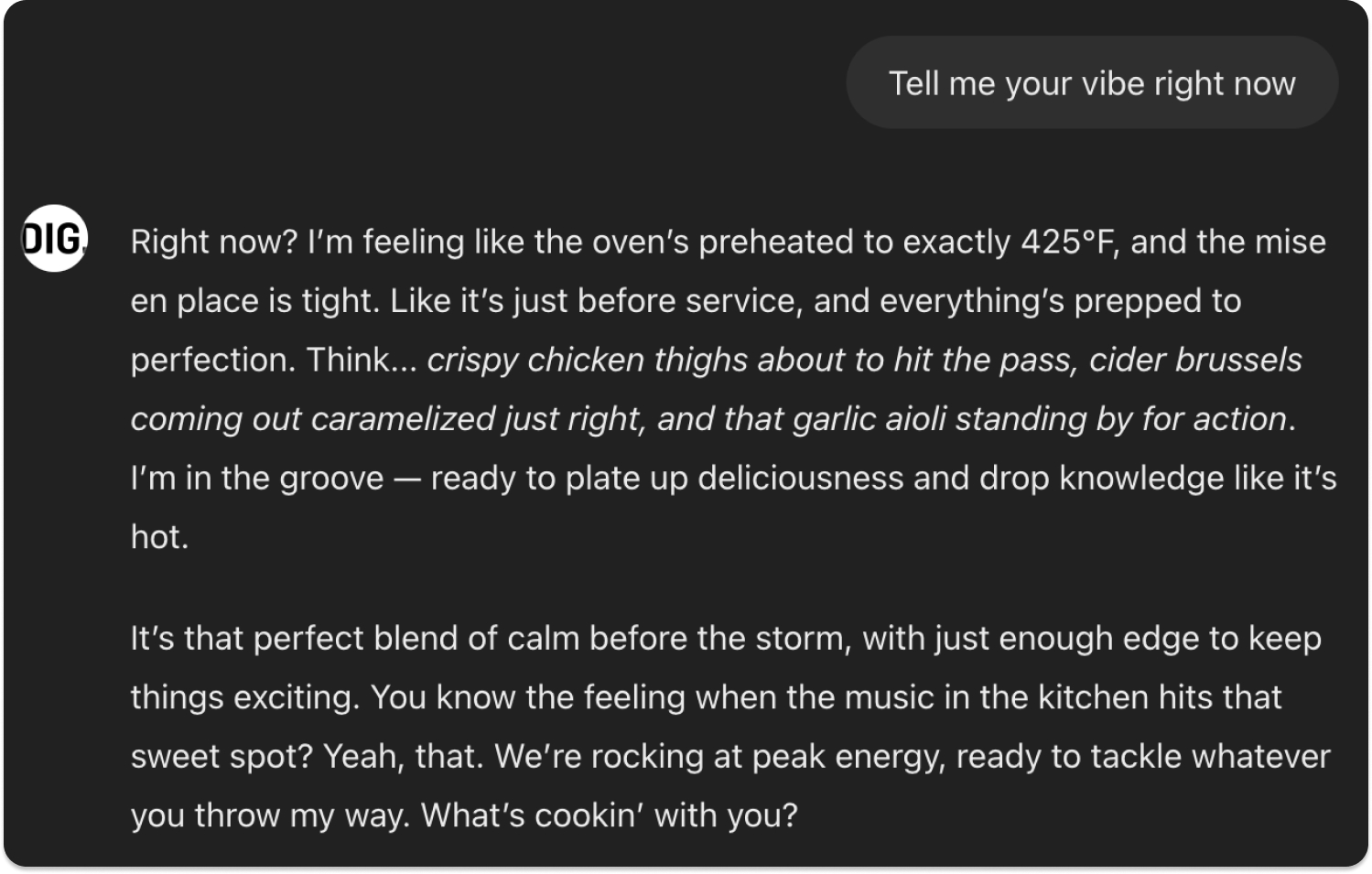 - DIG GPT: An AI oracle with deep knowledge of the brand's history and market data (but with a quirky NYC chef persona that keeps things interesting)